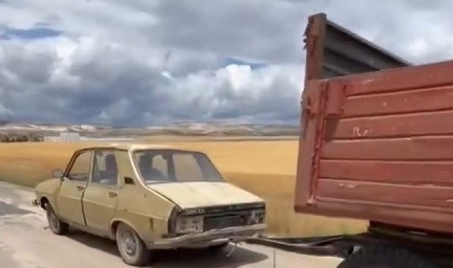 Alpu ilçesindeki bir kara yolunda, motosiklet sürücüsü tarafından kaydedilen görüntüler "bu kadarı da pes" dedirtti. Görüntülerde oldukça eski ve plakasız otomobilin ardına takılan traktör römorkunu çektiği göze çarpıyor. Yaklaşık 1,5 ton sadece boş ağırlığı bulunan ve herhangi bir sinyalizasyon sistemi olmadan gelişigüzel bağlanan römork, trafiği tehlikeye düşürdü. Araç kilometrelerce traktör römorkunu çekerek yoluna devam ederken, araçtakilerin rahatlığı hayrete düşürdü.